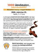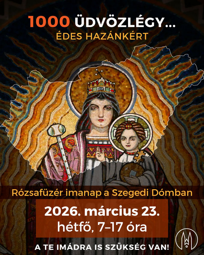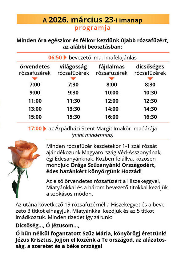 2026. március 23-án, hétfőn, reggel 7 órától 17 óráig az imakör vezetésével húsz teljes rózsafüzért imádkozunk el Magyarországért a közösségben szokásos módon. Az imakör ezen a napon ünnepli 6. születésnapját.