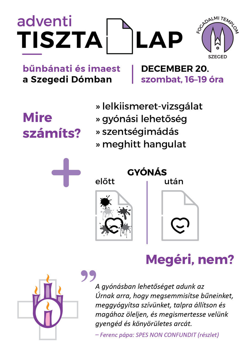Bűnbánati és imanestet tartunk templomunkban december 20-án, szombaton "adventi Tiszta Lap" címmel. A program részletei a képre kattintva olvashatók.