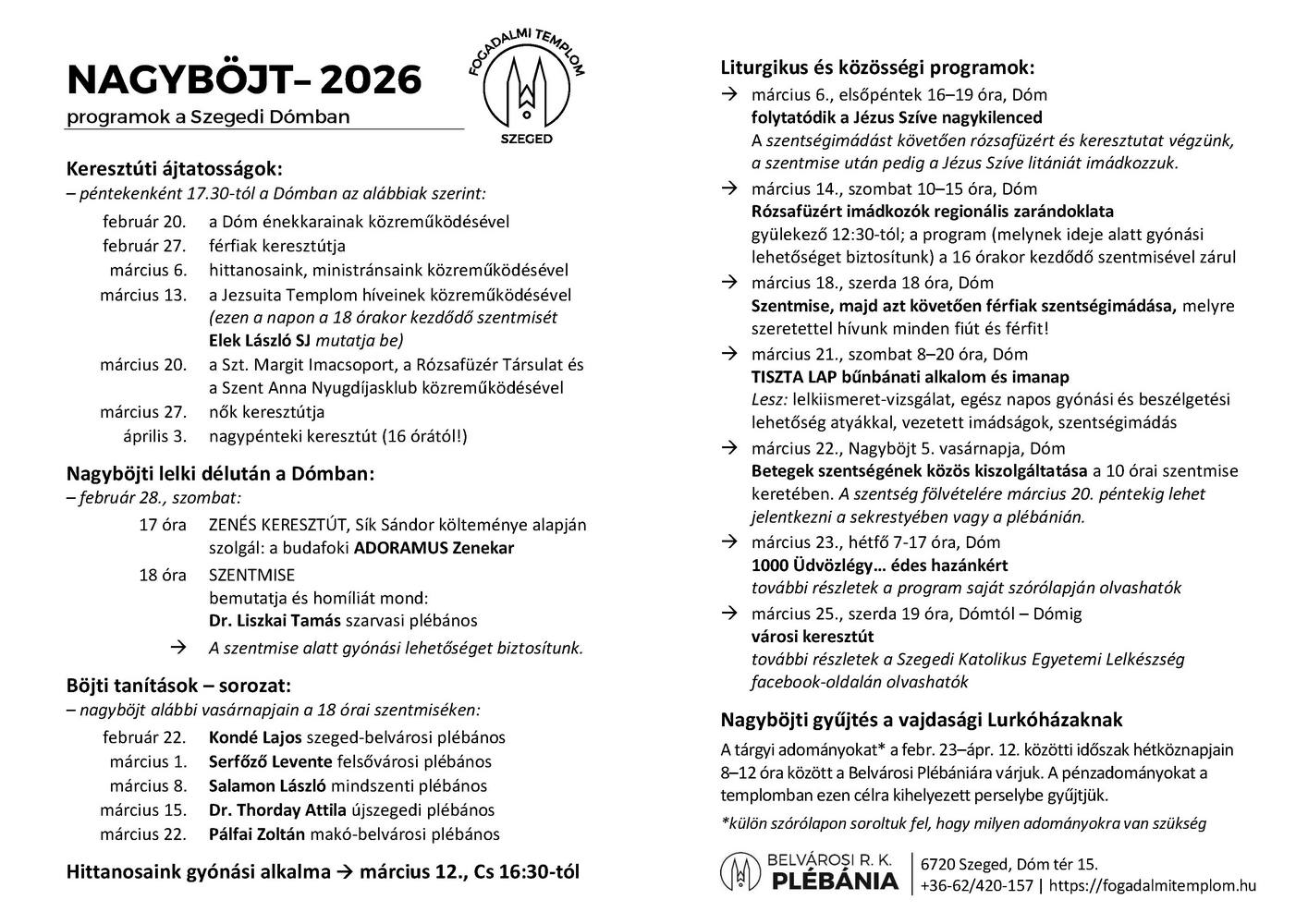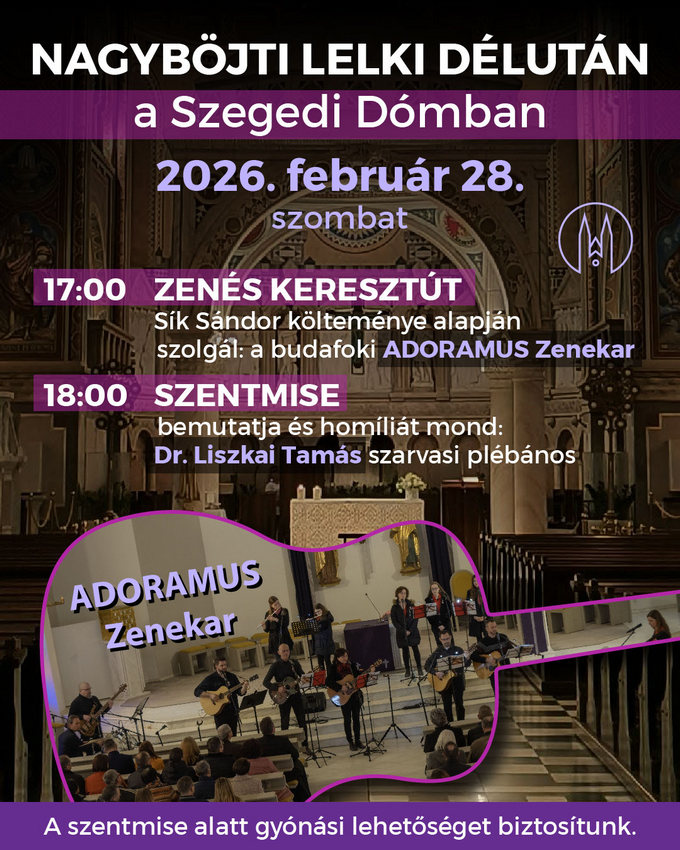 Nagyböjti lelki délutánra hívjuk és várjuk a kedves testvéreket 2026. február 28-án, szombaton 17 órától a Szegedi Dómba.