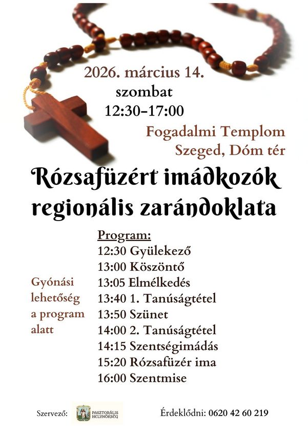 A rózsafüzért imádkozók regionális zarándoklata idén március 14-én, 12:30-kor kezdődik a Szegedi Dómban. A program – melynek ideje alatt gyónási lehetőséget biztosítunk – a 16 órakor kezdődő szentmisével zárul.