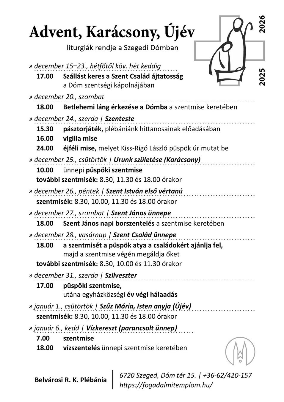 Az adventi, karácsonyi és újévi liturgiák rendjéről készült szórólapot az alábbi képre kattintva olvashatják, vagy a szöveges linkről le is tölthetik.