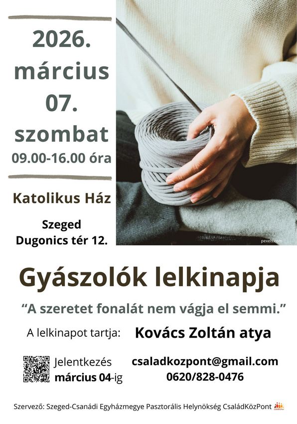 A Szeged-Csanádi Egyházmegye CsaládKözPontja lelkinapra hívja a gyászolókat és özvegyeket 2026. március 7-én, szombaton 9-től 16 óráig Szegedre, a Katolikus Házba (Dugonics tér 12.)